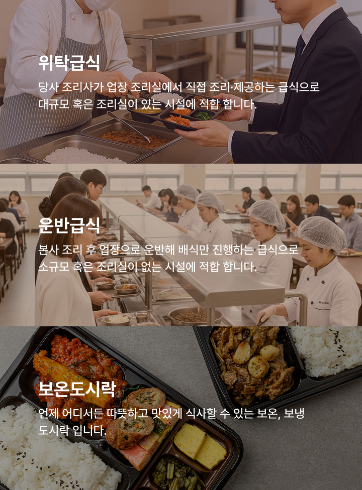 다함푸드는 위탁급식, 운반급식, 보온도시락 등 각기 다른 형태의 서비스를 운영하며