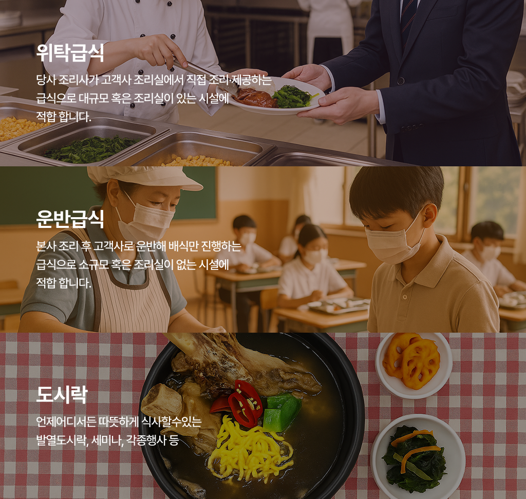 다함푸드는 위탁급식, 운반급식, 도시락 등 각기 다른 형태의 서비스를 운영하며